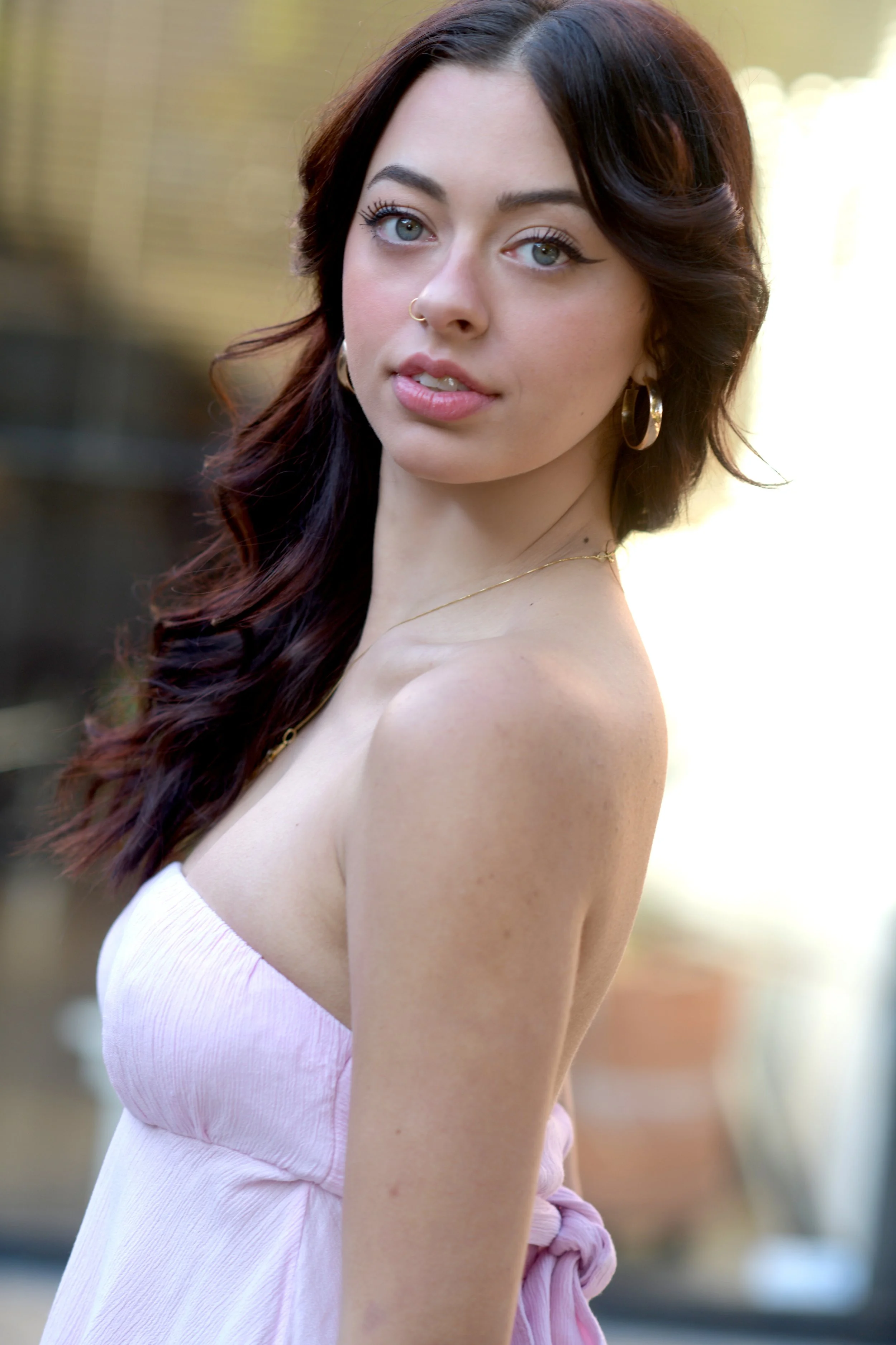 A young woman with long dark wavy hair, light skin, green eyes, wearing gold hoop earrings, a small nose ring, and a delicate gold necklace, looking over her shoulder in a strapless light pink dress outdoors.