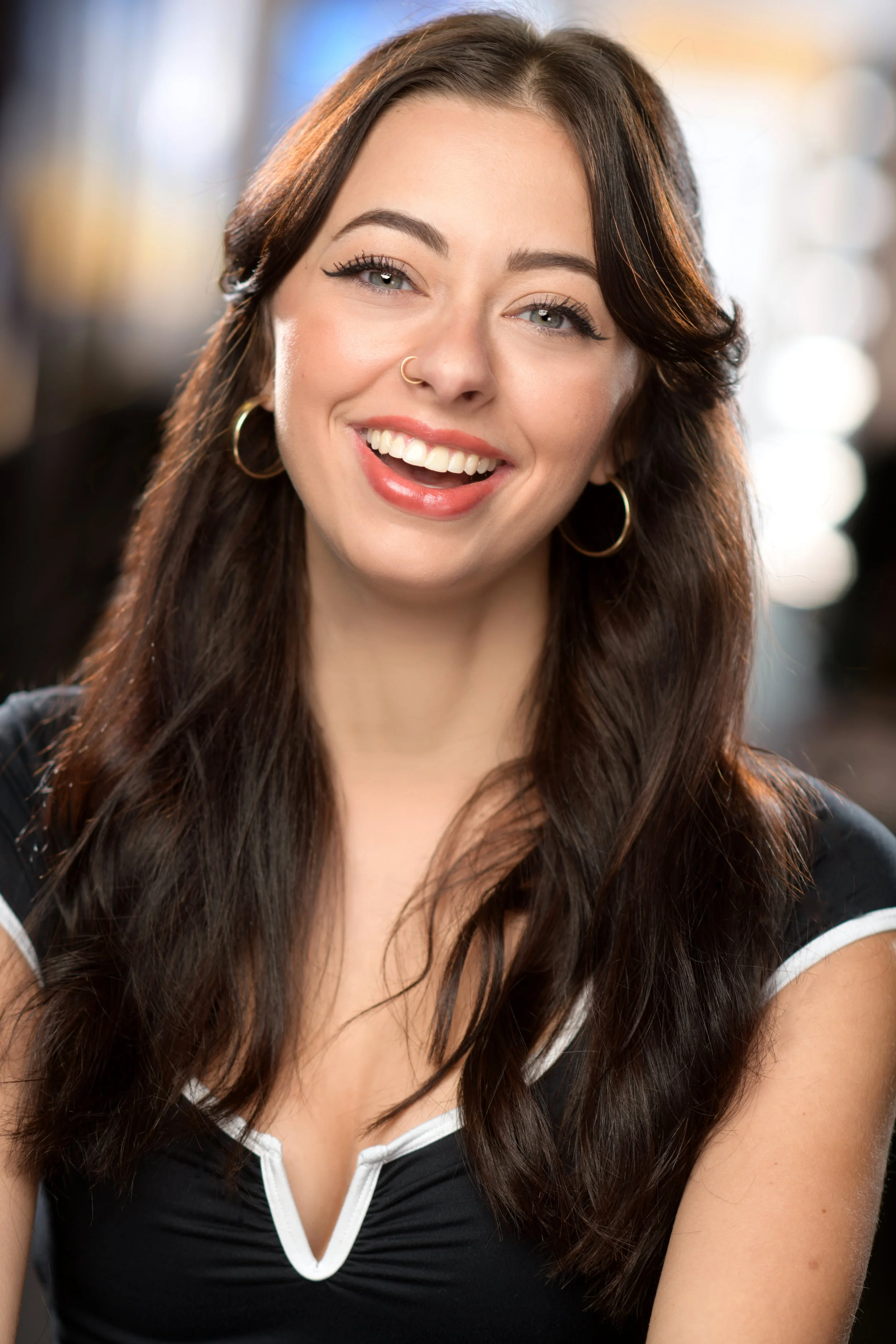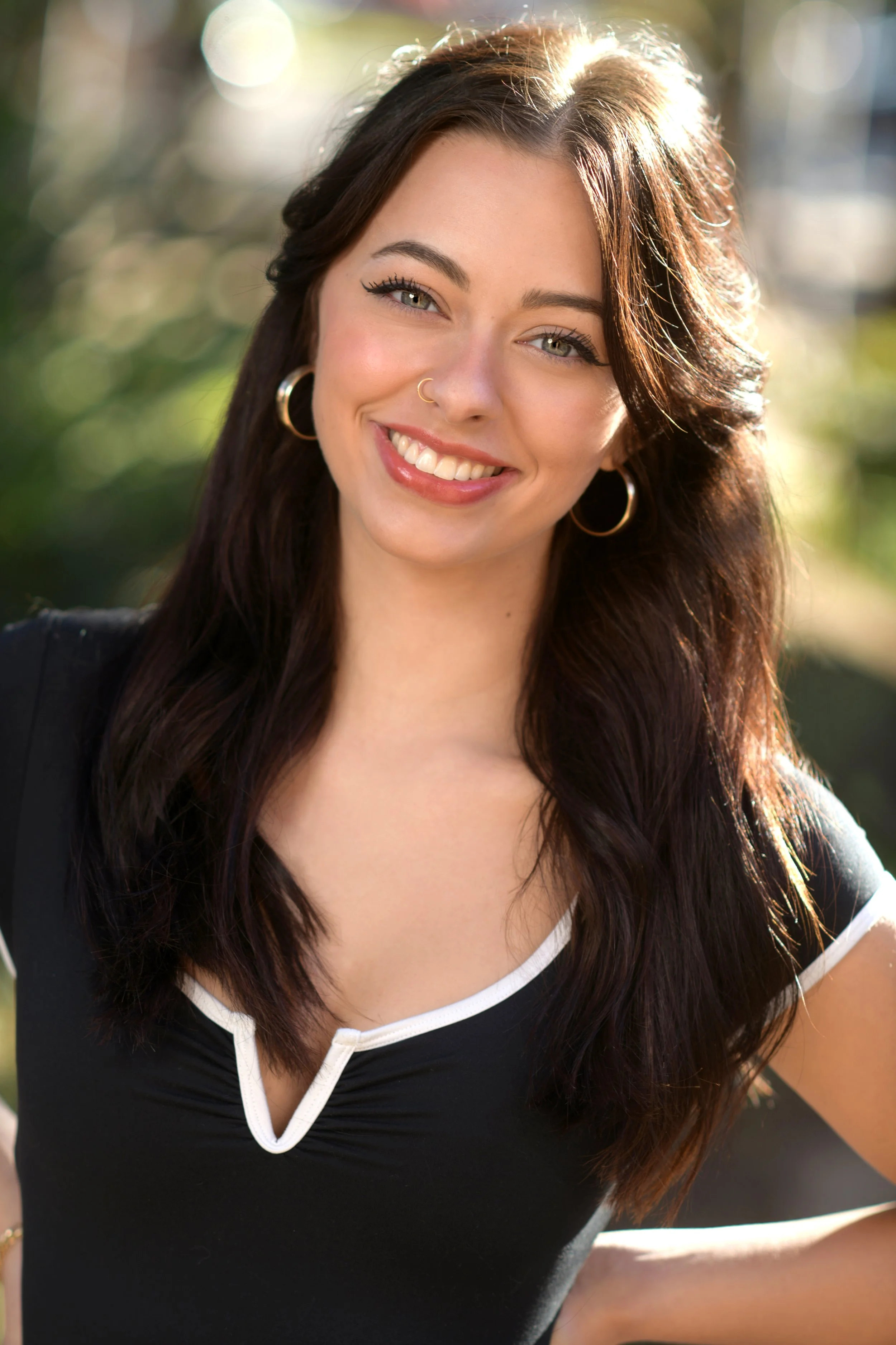 A young woman with long brown hair, light skin, wearing hoop earrings, a nose ring, and a black top with white trim, smiling outdoors with a blurred background.