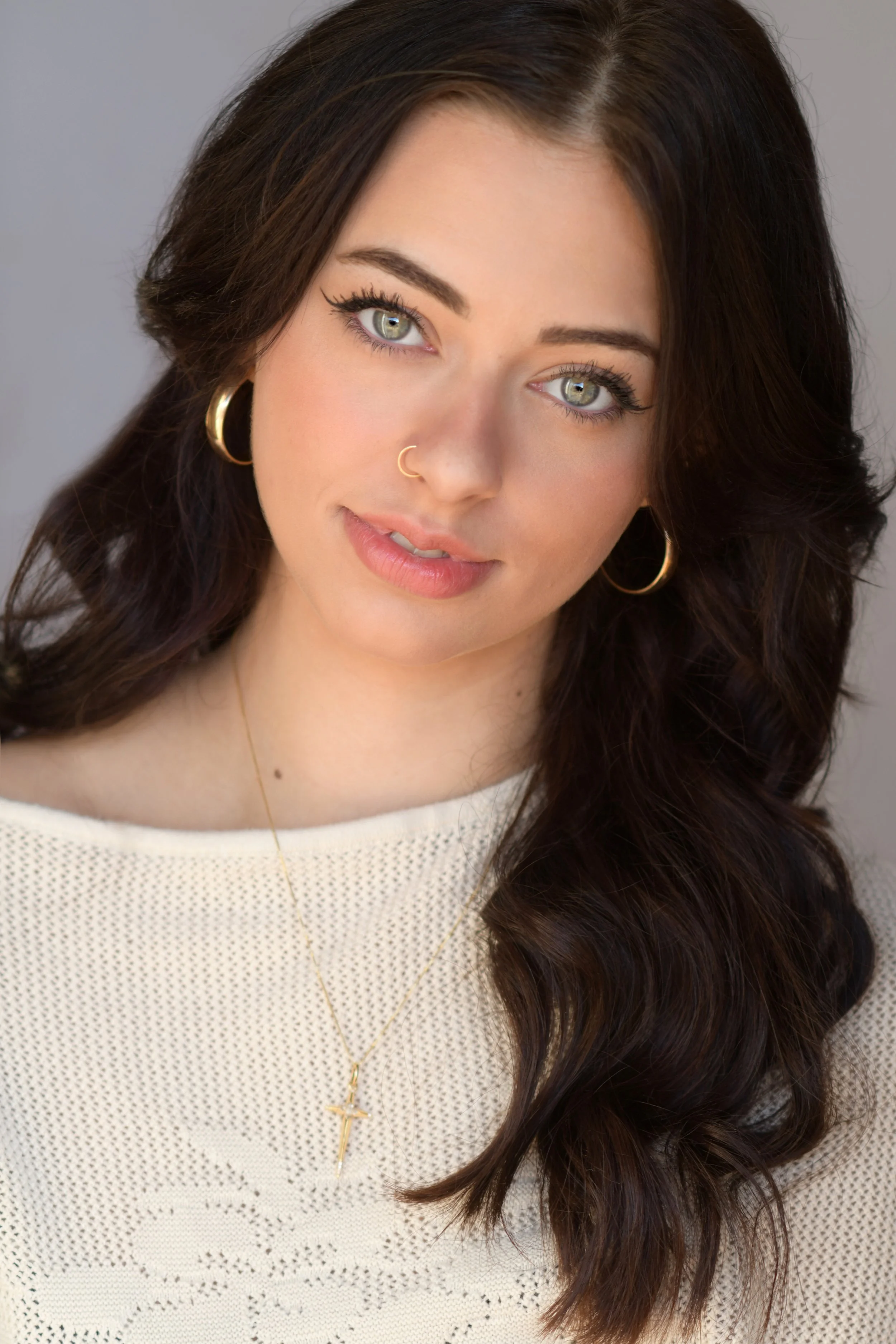 Close-up portrait of a woman with long wavy brown hair, wearing gold hoops, a nose ring, and a white textured top.